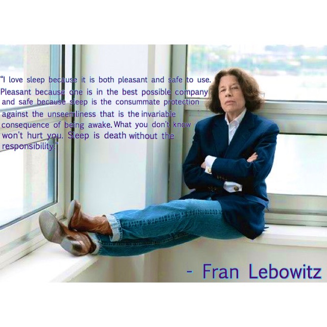 She’s Awesome, Witty, and just overall CoolI totally get this. I even dream of sleeping. I look forwards not being plugged into the constant. The always happening N.E.W.S. which is always reminding me of some new way to be terrorized. Sleep is necessary but we fight to avoid it because of the business of the everyday waking life. But, like Fran – the invariable of being awake is enough to avoid as much as possible. I get a lot of work done in my dreams. I understand what’s happening and how the past happened by listening to my dreams. So now // zzzz’s lead to A.